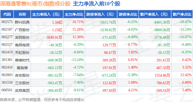 资金流向方面,深港通零售R(港币)(483074)指数成份股当日主力资金净流出合计2034.29万元,游资资金净流出合计1.47亿元,散户资金净流入合计1.67亿元。成份股资金流向详情见下表: