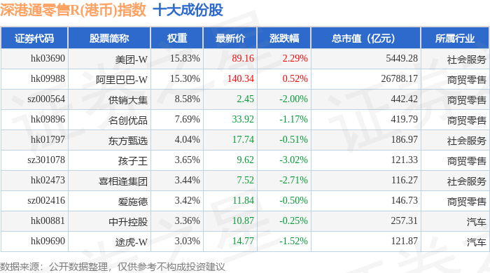 深港通零售R(港币)(483074)指数十大成份股详情如下: