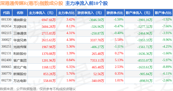 资金流向方面,深港通传媒R(港币)(483076)指数成份股当日主力资金净流出合计11.89亿元,游资资金净流入合计3.08亿元,散户资金净流入合计8.82亿元。成份股资金流向详情见下表: