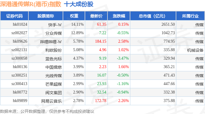 深港通传媒R(港币)(483076)指数十大成份股详情如下: