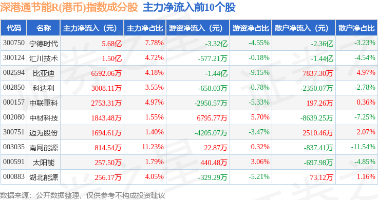 资金流向方面,深港通节能R(港币)(483086)指数成份股当日主力资金净流出合计13.67亿元,游资资金净流出合计5.69亿元,散户资金净流入合计19.36亿元。成份股资金流向详情见下表: