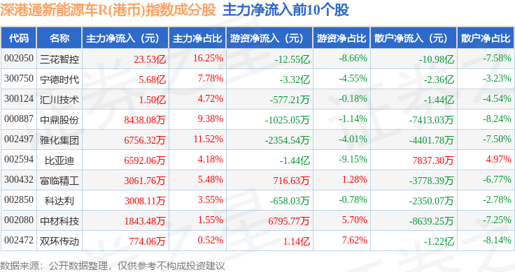 资金流向方面,深港通新能源车R(港币)(483088)指数成份股当日主力资金净流入合计13.53亿元,游资资金净流出合计14.03亿元,散户资金净流入合计4919.79万元。成份股资金流向详情见下表: