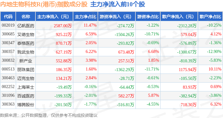 资金流向方面,内地生物科技R(港币)(483102)指数成份股当日主力资金净流出合计4.86亿元,游资资金净流入合计1.13亿元,散户资金净流入合计3.73亿元。成份股资金流向详情见下表: