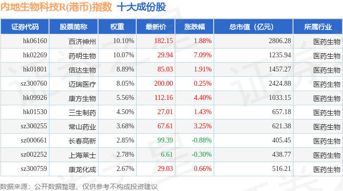 内地生物科技R(港币)(483102)指数十大成份股详情如下: