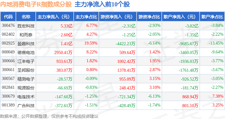 资金流向方面,内地消费电子R(483105)指数成份股当日主力资金净流出合计12.2亿元,游资资金净流出合计2.86亿元,散户资金净流入合计15.05亿元。成份股资金流向详情见下表: