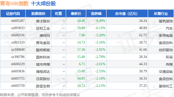 证券之星消息,12月4日,青岛50R(489011)指数报收于2673.36点,跌0.28%,成交61.82亿元,换手率1.09%。当日该指数成份股中,上涨的有13家,国恩股份以5.24%的涨幅领涨,下跌的有28家,德才股份以8.49%的跌幅领跌。