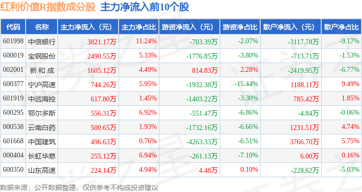 资金流向方面,红利价值R(489016)指数成份股当日主力资金净流出合计9.39亿元,游资资金净流入合计5300.21万元,散户资金净流入合计8.86亿元。成份股资金流向详情见下表: