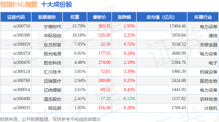创指ESG(970028)指数十大成份股详情如下: