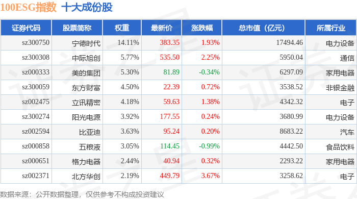 100ESG(970027)指数十大成份股详情如下: