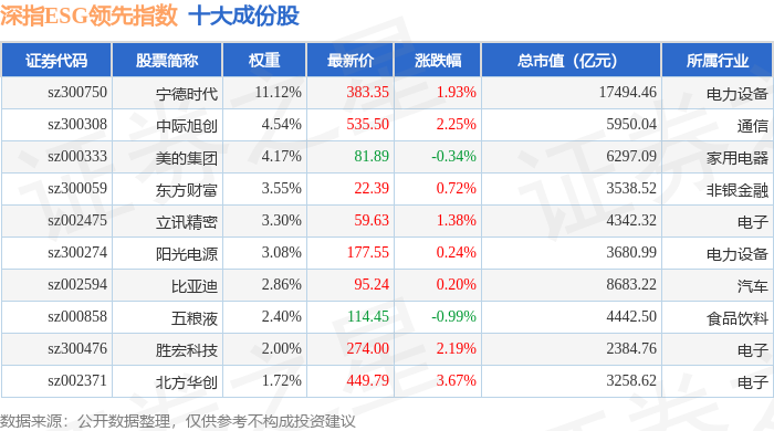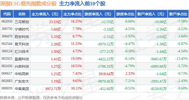 资金流向方面,深指ESG领先(970029)指数成份股当日主力资金净流出合计12.85亿元,游资资金净流出合计25.95亿元,散户资金净流入合计38.8亿元。成份股资金流向详情见下表: