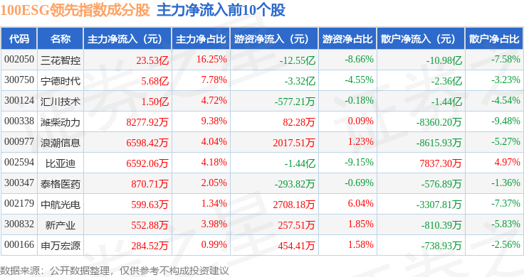 资金流向方面,100ESG领先(970030)指数成份股当日主力资金净流入合计1.2亿元,游资资金净流出合计12.97亿元,散户资金净流入合计11.77亿元。成份股资金流向详情见下表: