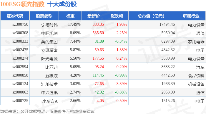 100ESG领先(970030)指数十大成份股详情如下: