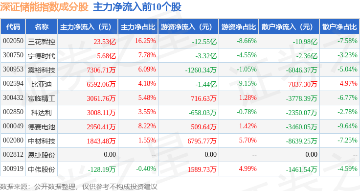 资金流向方面,深证储能(970036)指数成份股当日主力资金净流入合计5.21亿元,游资资金净流出合计16.51亿元,散户资金净流入合计11.3亿元。成份股资金流向详情见下表: