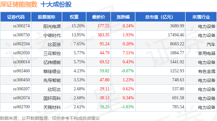 证券之星消息,12月4日,深证储能(970036)指数报收于10493.97点,涨0.59%,成交634.53亿元,换手率2.99%。当日该指数成份股中,上涨的有20家,三花智控以7.51%的涨幅领涨,下跌的有28家,银河电子以8.28%的跌幅领跌。