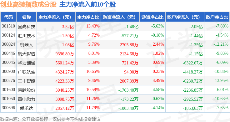 资金流向方面,创业高装(970040)指数成份股当日主力资金净流入合计3743.19万元,游资资金净流出合计4708.7万元,散户资金净流入合计965.51万元。成份股资金流向详情见下表:
