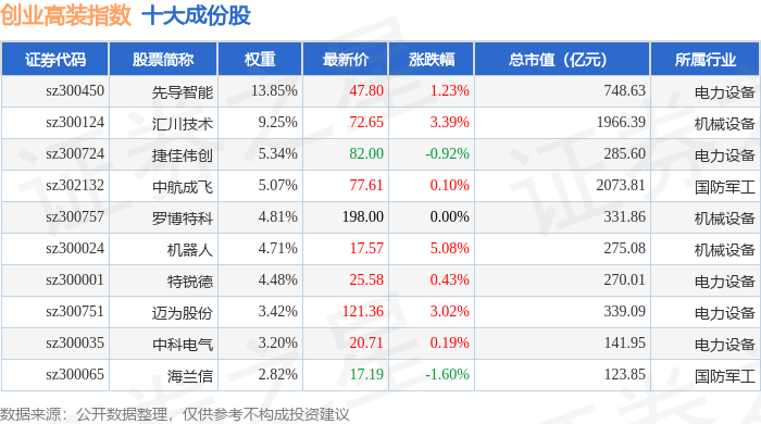 证券之星消息,12月4日,创业高装(970040)指数报收于3903.33点,涨0.71%,成交259.37亿元,换手率4.6%。当日该指数成份股中,上涨的有24家,固高科技以19.99%的涨幅领涨,下跌的有25家,新雷能以7.22%的跌幅领跌。