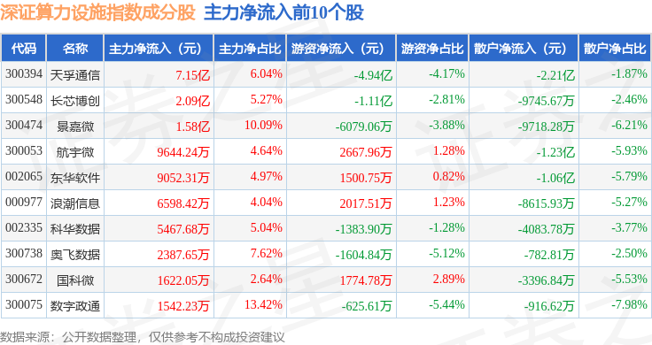 资金流向方面,深证算力设施(970051)指数成份股当日主力资金净流出合计11.32亿元,游资资金净流出合计1.44亿元,散户资金净流入合计12.76亿元。成份股资金流向详情见下表: