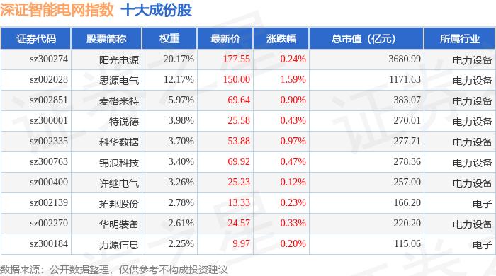 深证智能电网(970054)指数十大成份股详情如下: