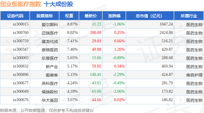 证券之星消息,12月4日,创业板医疗(970082)指数报收于3620.62点,跌0.46%,成交65.63亿元,换手率0.96%。当日该指数成份股中,上涨的有11家,中红医疗以3.82%的涨幅领涨,下跌的有38家,爱美客以2.29%的跌幅领跌。
