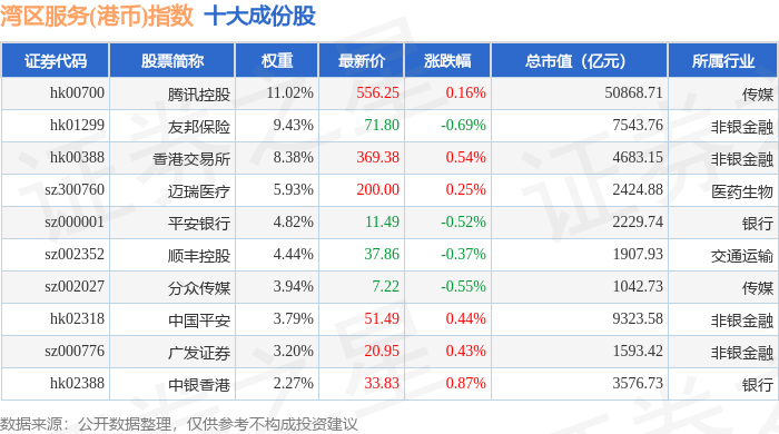 湾区服务(港币)(980012)指数十大成份股详情如下: