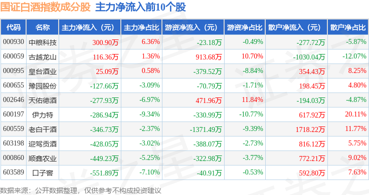 资金流向方面,国证白酒(980031)指数成份股当日主力资金净流出合计20.2亿元,游资资金净流入合计5.81亿元,散户资金净流入合计14.38亿元。成份股资金流向详情见下表: