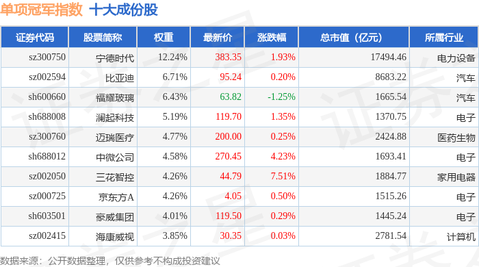 单项冠军(980150)指数十大成份股详情如下: