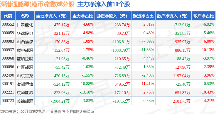 资金流向方面,深港通能源(港币)(983014)指数成份股当日主力资金净流出合计1.27亿元,游资资金净流入合计5908.58万元,散户资金净流入合计6782.07万元。成份股资金流向详情见下表: