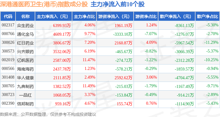 资金流向方面,深港通医药卫生(港币)(983024)指数成份股当日主力资金净流出合计14.54亿元,游资资金净流入合计3765.82万元,散户资金净流入合计14.16亿元。成份股资金流向详情见下表: