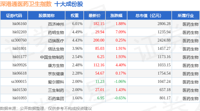 深港通医药卫生(983023)指数十大成份股详情如下: