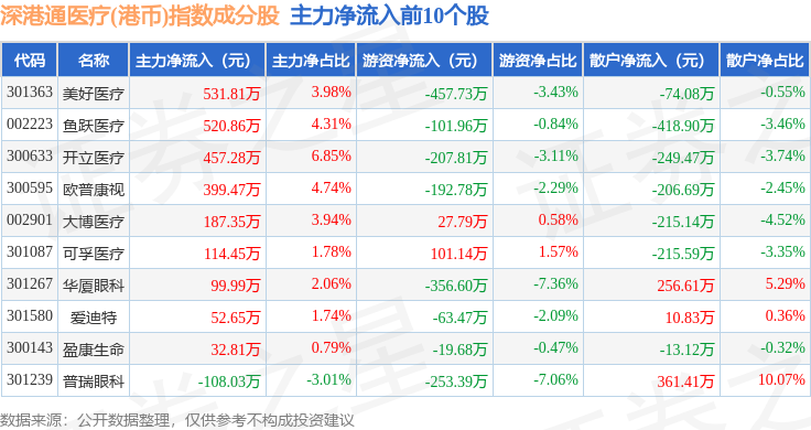 资金流向方面,深港通医疗(港币)(983036)指数成份股当日主力资金净流出合计3.3亿元,游资资金净流入合计979.64万元,散户资金净流入合计3.2亿元。成份股资金流向详情见下表: