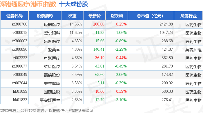 深港通医疗(港币)(983036)指数十大成份股详情如下: