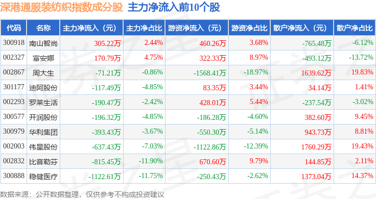 资金流向方面,深港通服装纺织(983041)指数成份股当日主力资金净流出合计2.51亿元,游资资金净流出合计1491.34万元,散户资金净流入合计2.66亿元。成份股资金流向详情见下表:
