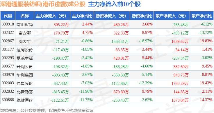 资金流向方面,深港通服装纺织(港币)(983042)指数成份股当日主力资金净流出合计2.51亿元,游资资金净流出合计1491.34万元,散户资金净流入合计2.66亿元。成份股资金流向详情见下表: