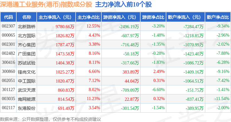 资金流向方面,深港通工业服务(港币)(983056)指数成份股当日主力资金净流出合计6.07亿元,游资资金净流出合计9893.62万元,散户资金净流入合计7.06亿元。成份股资金流向详情见下表: