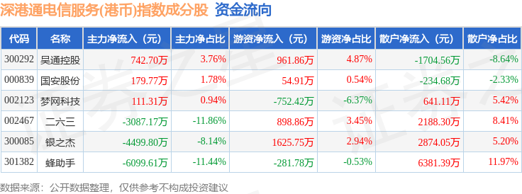 资金流向方面,深港通电信服务(港币)(983058)指数成份股当日主力资金净流出合计1.27亿元,游资资金净流入合计2507.18万元,散户资金净流入合计1.01亿元。成份股资金流向详情见下表: