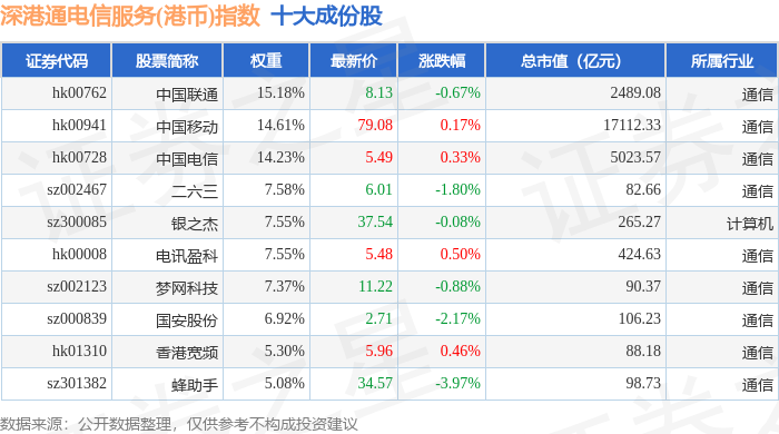 深港通电信服务(港币)(983058)指数十大成份股详情如下: