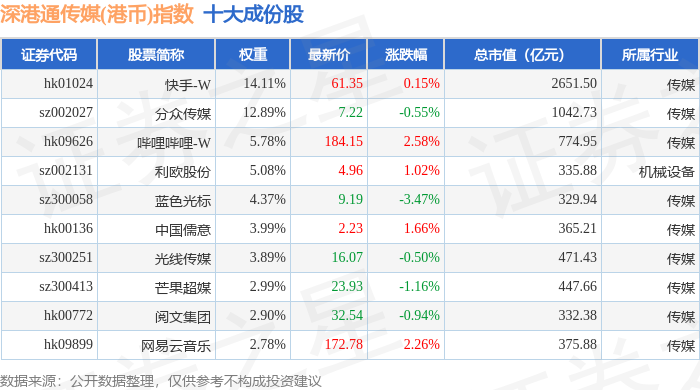 深港通传媒(港币)(983076)指数十大成份股详情如下: