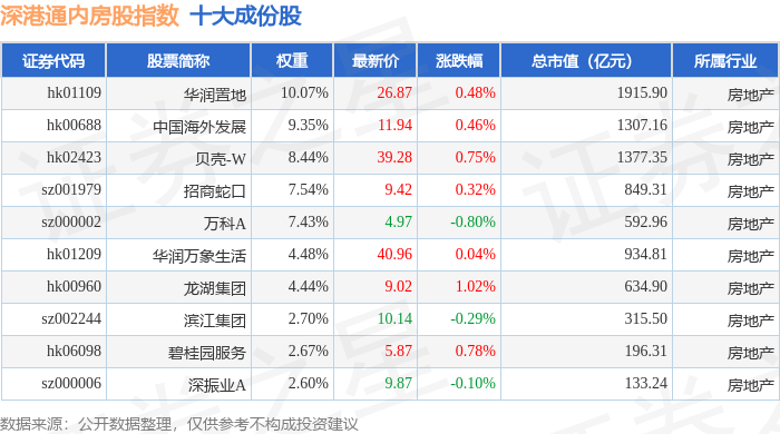 证券之星消息,12月4日,深港通内房股(983083)指数报收于740.39点,涨0.03%,成交92.65亿元,换手率1.14%。当日该指数成份股中,上涨的有21家,海宁皮城以10.06%的涨幅领涨,下跌的有26家,世联行以6.21%的跌幅领跌。