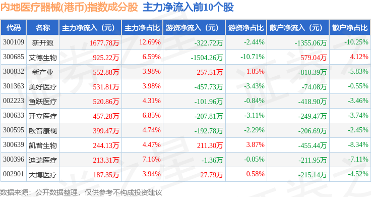 资金流向方面,内地医疗器械(港币)(983104)指数成份股当日主力资金净流出合计2.76亿元,游资资金净流出合计1319.95万元,散户资金净流入合计2.89亿元。成份股资金流向详情见下表: