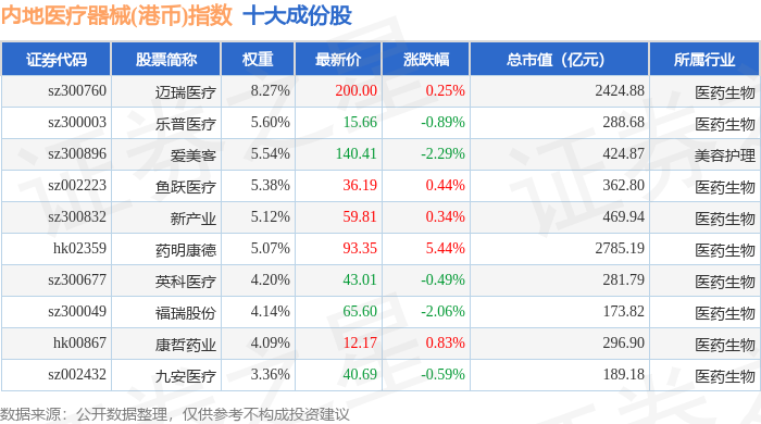内地医疗器械(港币)(983104)指数十大成份股详情如下:
