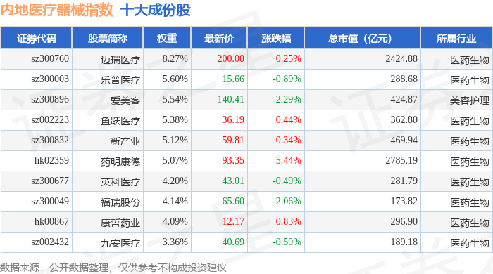 内地医疗器械(983103)指数十大成份股详情如下: