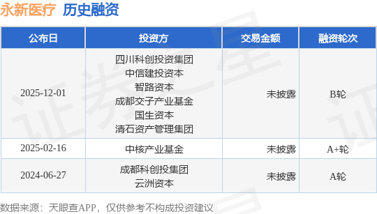 证券之星消息,根据天眼查APP于12月1日公布的信息整理,成都永新医疗设备股份有限公司B轮融资,融资额未披露,参与投资的机构包括四川科创投资集团,中信建投资本,智路资本,成都交子产业基金,国生资本,清石资产管理集团。