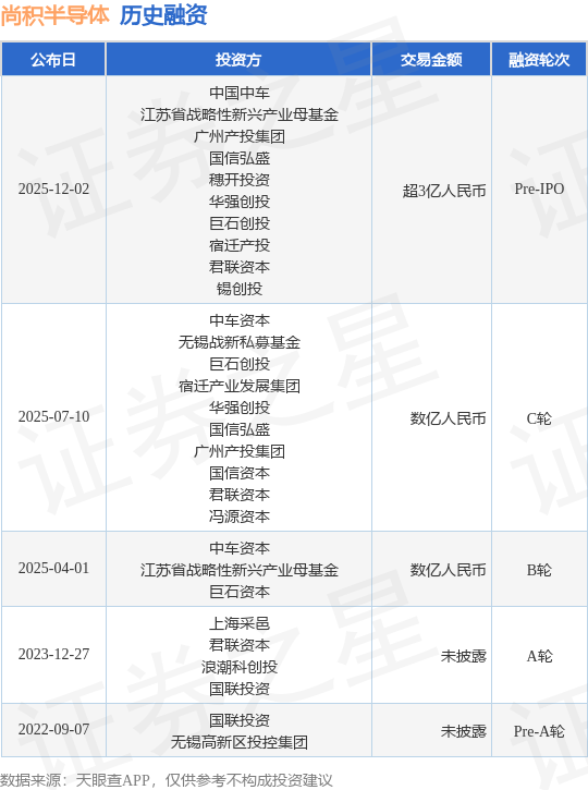 证券之星消息,根据天眼查APP于12月2日公布的信息整理,无锡尚积半导体科技股份有限公司Pre-IPO融资,融资额超3亿人民币,参与投资的机构包括中国中车,江苏省战略性新兴产业母基金,广州产投集团,国信弘盛,穗开投资,华强创投,巨石创投,宿迁产投,君联资本,锡创投。
