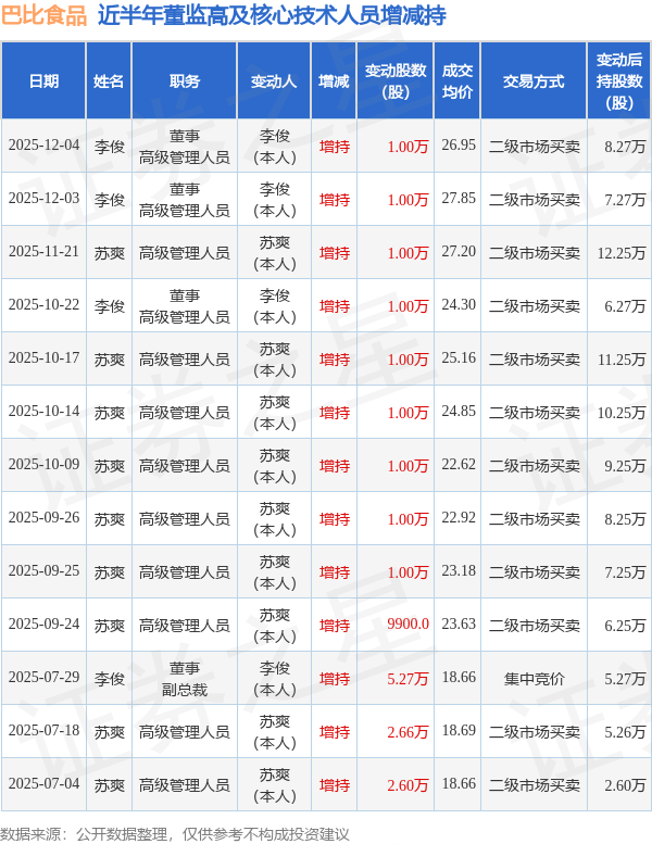 证券之星消息,根据12月4日市场公开信息、上市公司公告及交易所披露数据整理,巴比食品(605338)最新董监高及相关人员股份变动情况:2025年12月4日公司董事,高级管理人员李俊共增持公司股份1.0万股,占公司总股本为0.0042%。变动期间公司股价下跌3.75%,12月4日当日收盘报26.94元。