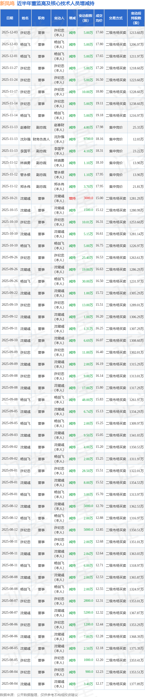 新凤鸣近半年内的董监高及核心技术人员增减持详情如下: