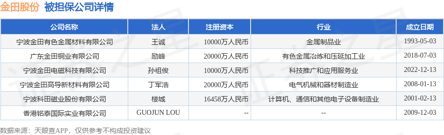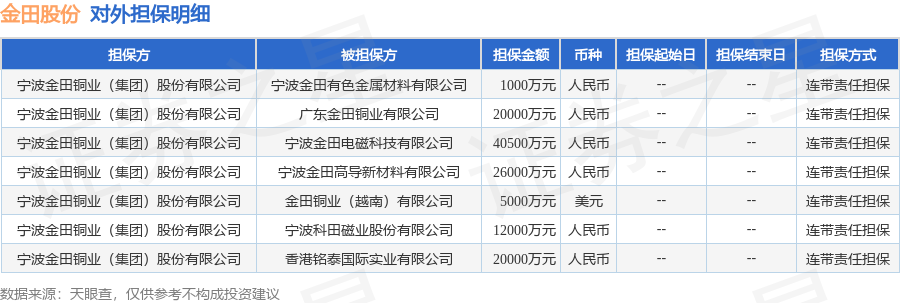 金田股份12月3日披露7笔对外担保,被担保公司7家。对外担保明细如下表: