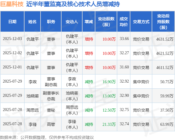 巨星科技近半年内的董监高及核心技术人员增减持详情如下: