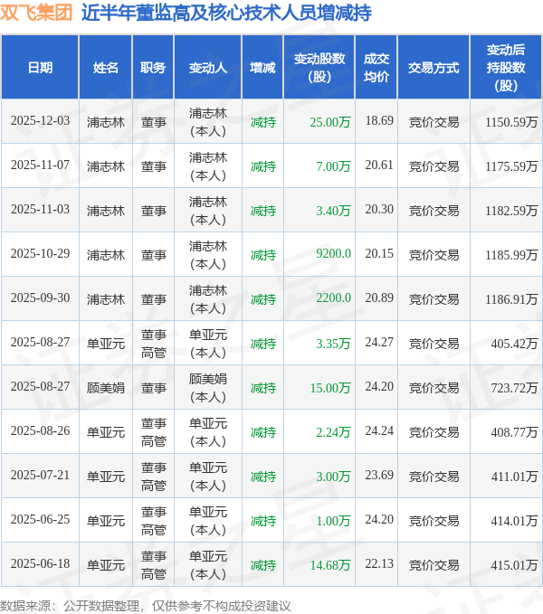 双飞集团近半年内的董监高及核心技术人员增减持详情如下: