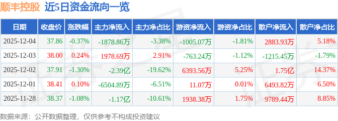 证券之星消息,截至2025年12月4日收盘,顺丰控股(002352)报收于37.86元,下跌0.37%,换手率0.31%,成交量14.71万手,成交额5.57亿元。