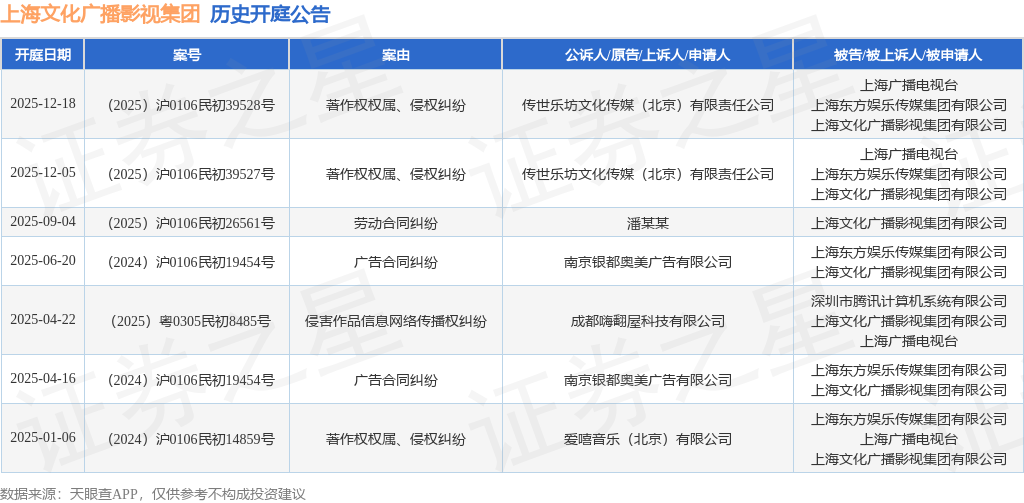 案号:(2025)沪0106民初39527号根据统计,近一年内以上海文化广播影视集团有限公司为当事人的历史开庭公告有7则,其中案由为“著作权权属、侵权纠纷”的公告以3则居首,其次为“广告合同纠纷”有2则,“侵害作品信息网络传播权纠纷”有1则。历史开庭公告如下: